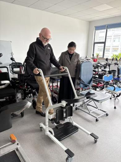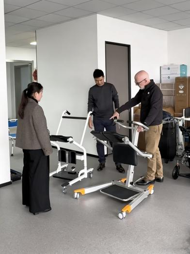 В сопровождении наших руководителей г-н Джеймс обсудил две модели многофункциональных подъемников для транспортировки пациентов, тщательно осмотрел конструкции образцов и провел испытания на месте.